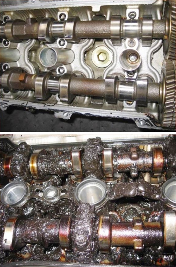 エンジン内部の写真です。上が奇麗な状態。下がオイル交換を怠ると…